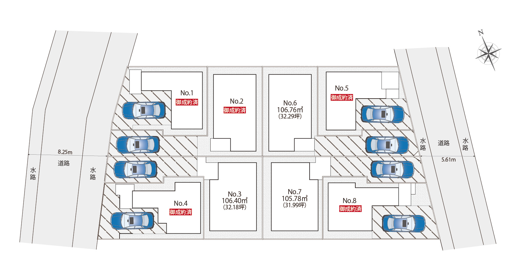 | 道路 | 1~4号棟西側約8.25m道路、6.7号棟東側約5.5m道路 |