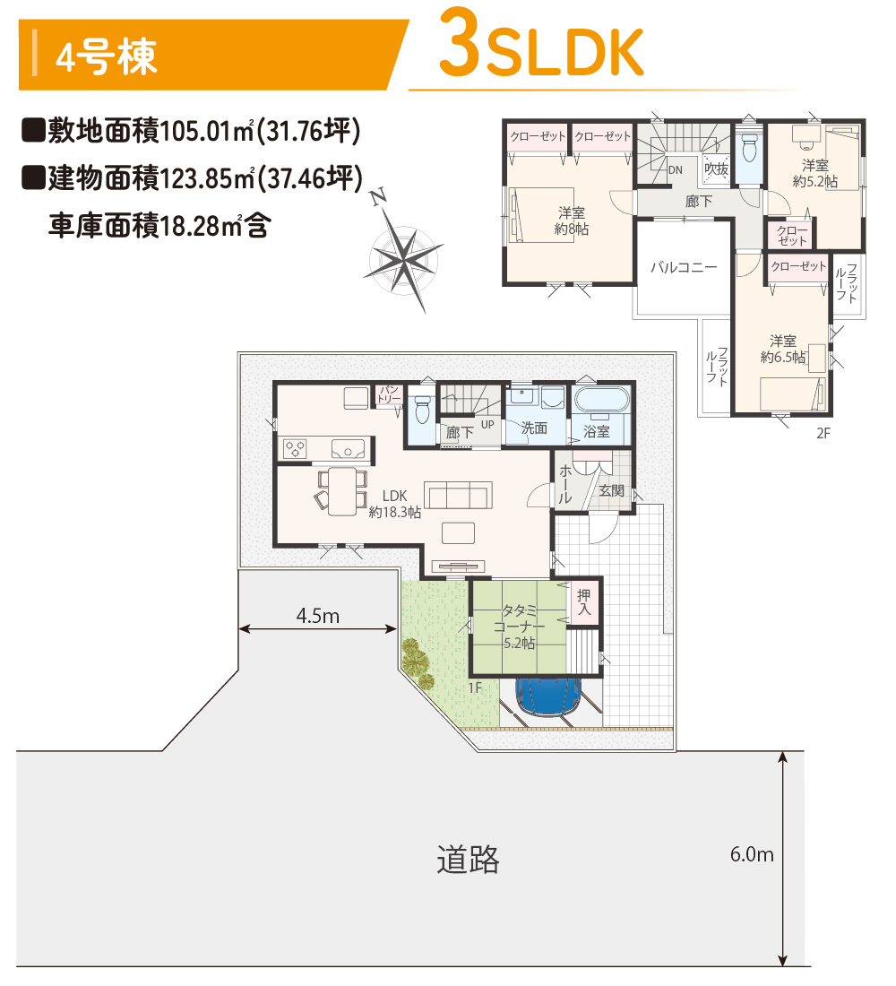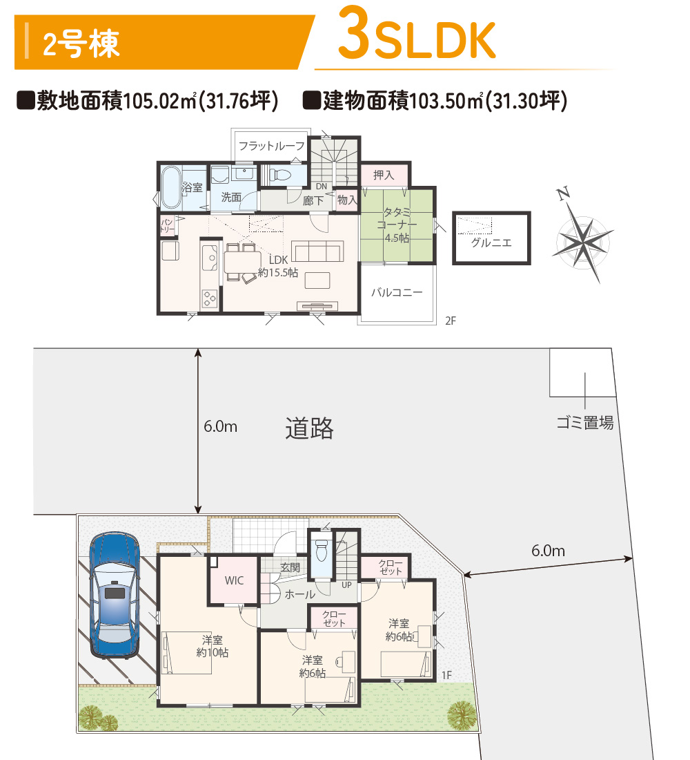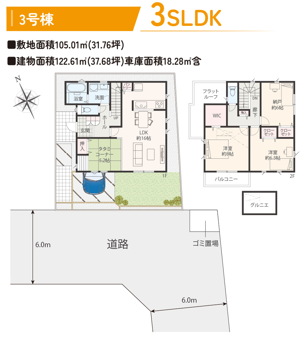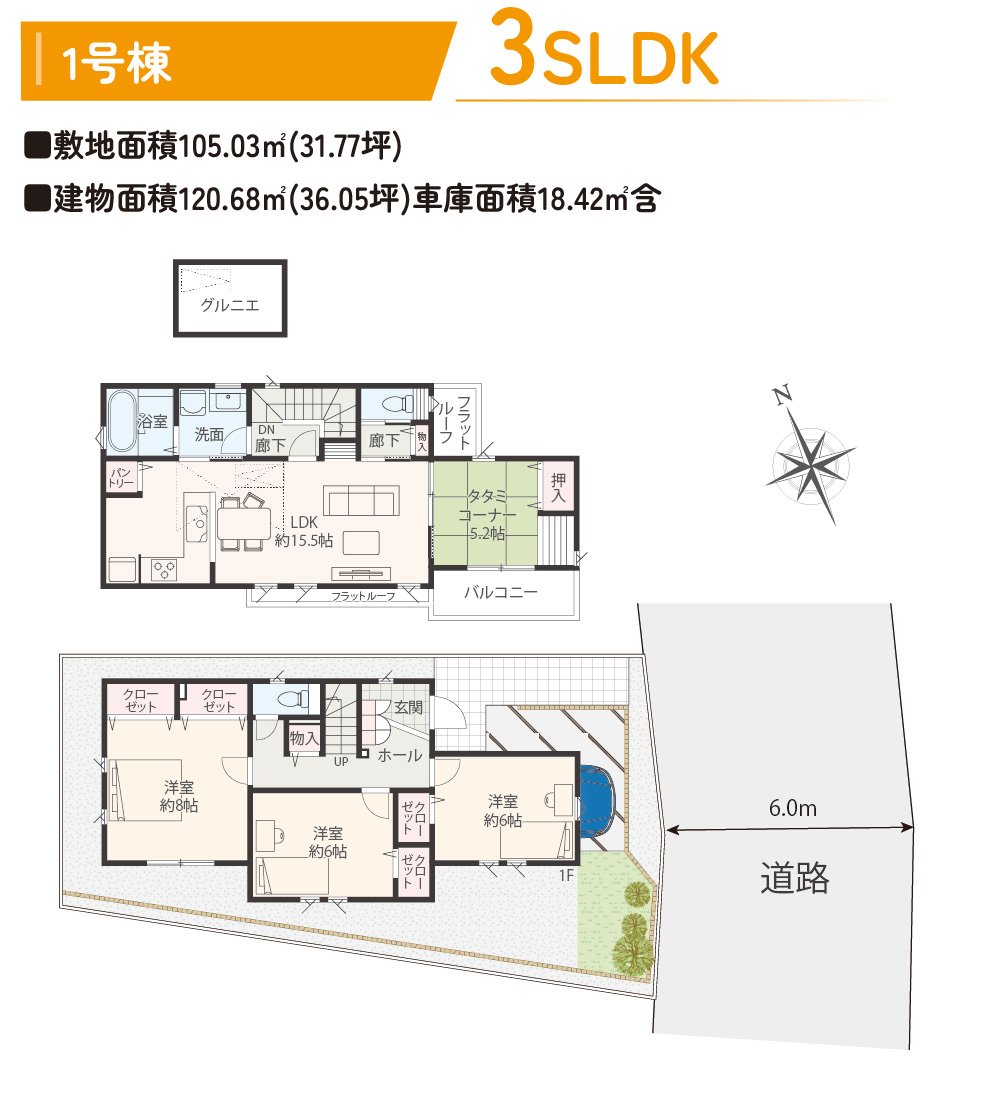 | 敷地面積 | 105.01㎡(31.76坪)~105.03㎡(31.77坪) |