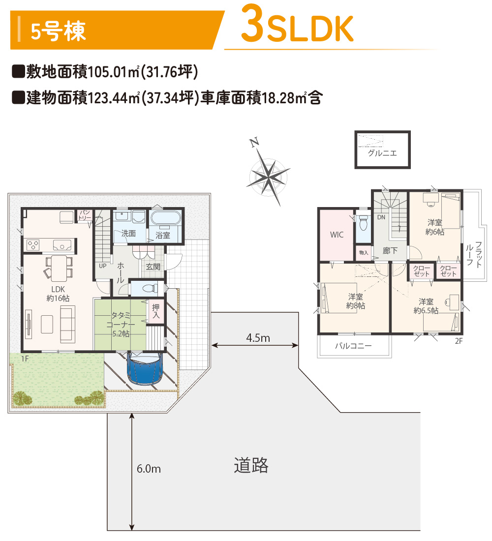 | 建物面積 | 03.50㎡(31.30坪)~123.85㎡(37.46坪)※1、3、4、5号棟車庫部分18.28~18.42㎡含 |